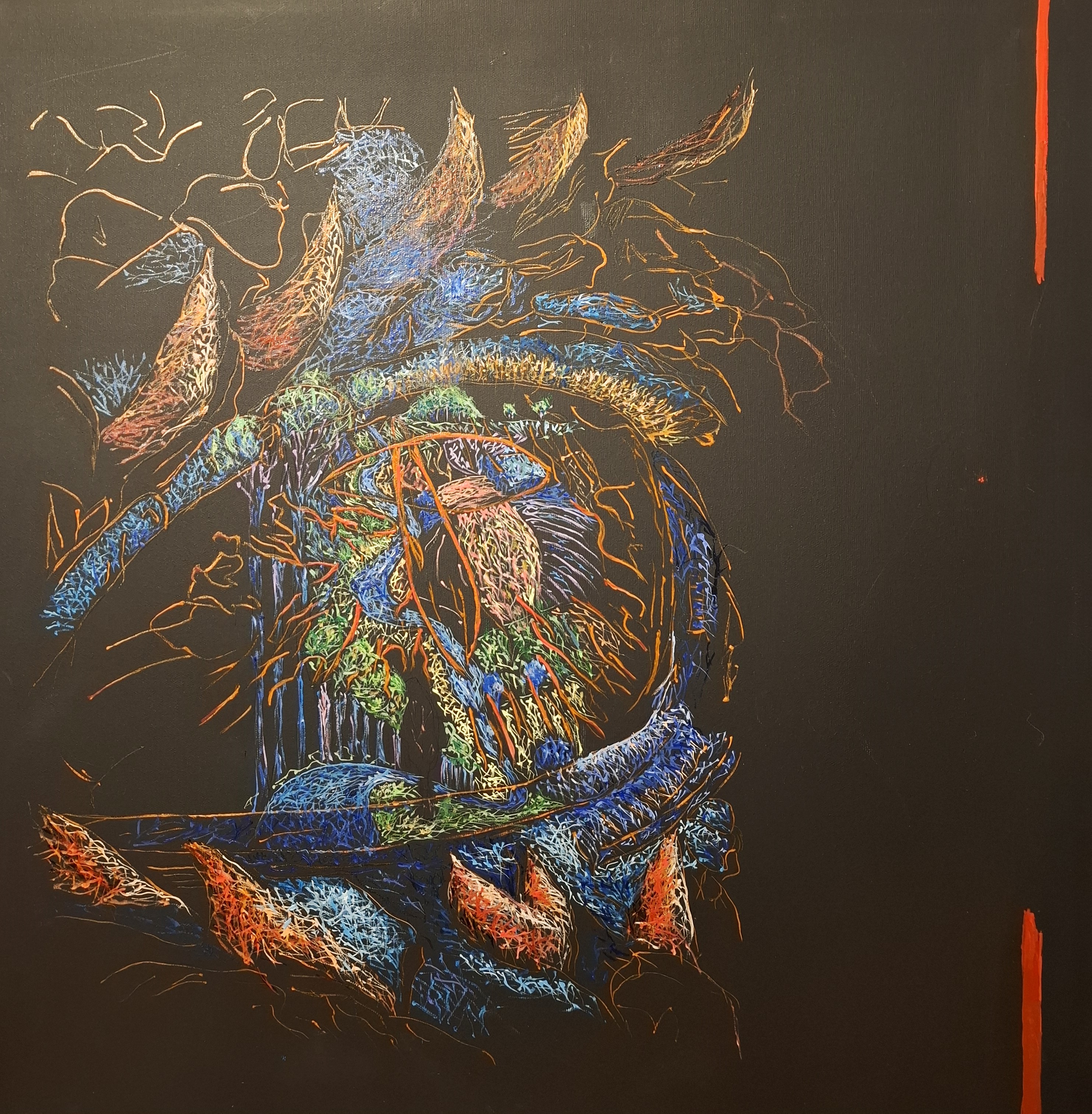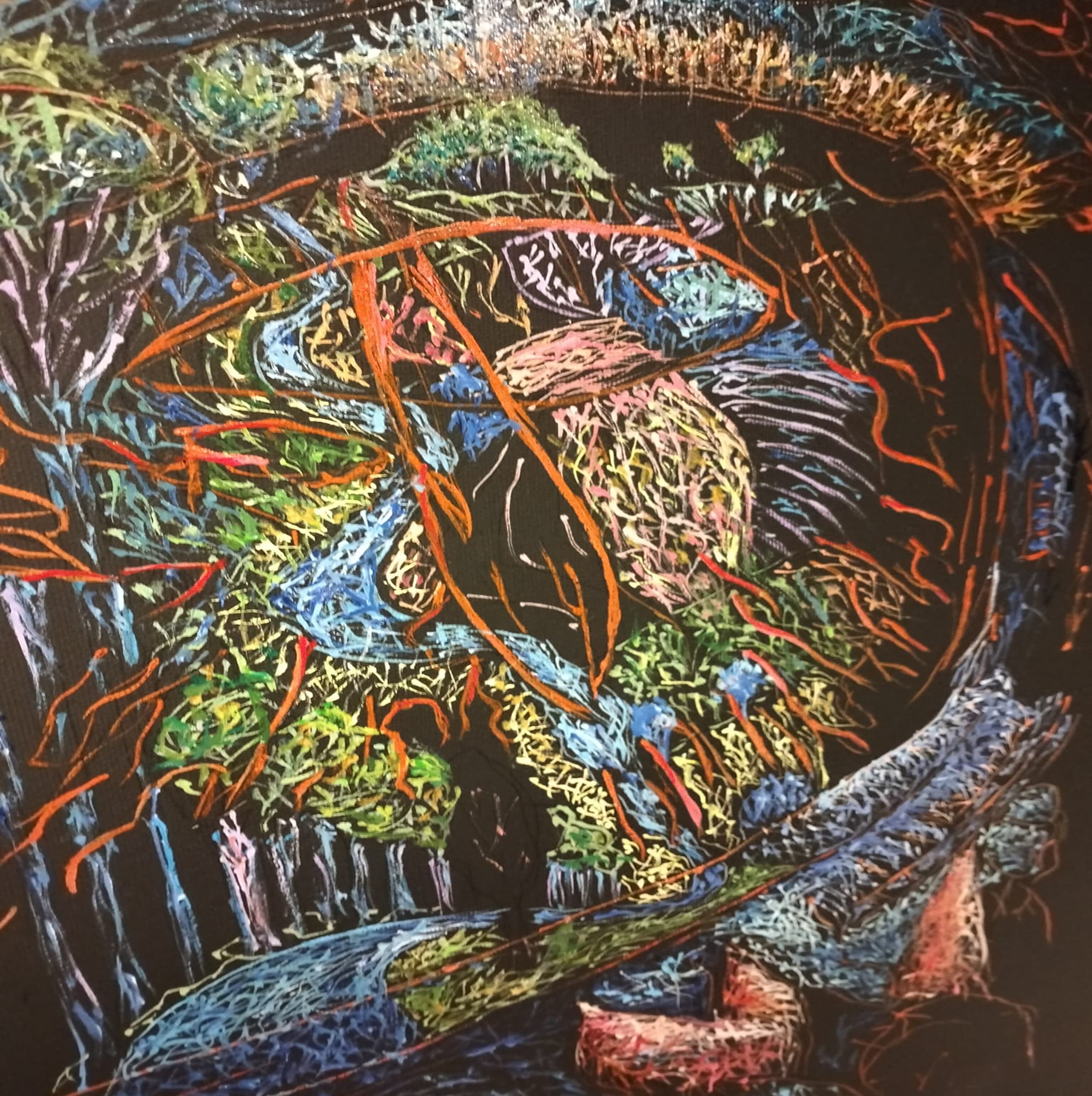 Este un peisaj al paradoxului si al profunzimii, unde realitatea se impleteste cu visul. in centrul imaginii, un ochi imens se deschide ca o fereastra spre infinit. in loc de iris, adaposteste o padure adanca, un labirint de copaci tacuti isi inalta coroanele. Padurea din ochi respira, fosneste, traieste propriul timp, iar printre crengile sale se filtreaza doua fante subtiri de lumina – ca niste portaluri ce taie intunericul, cautand un adevar. Un punct singuratic pluteste in acest spatiu enigmatic, un fir de esenta pura, un atom al intelesului nedeslusit. intreaga scena pare prinsa intr-un subtil al existentei, unda - particula si o data impleteste destinul, o poveste despre dualitate perceptie si mister. Unda sau particula